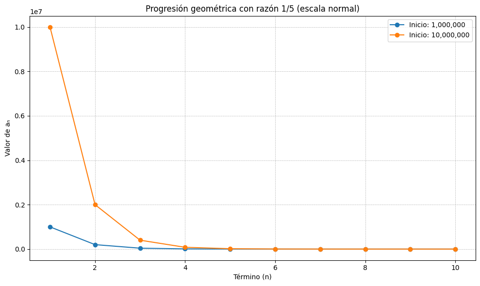 plt.title("Progresión geométrica con razón 1/5 (escala normal)")